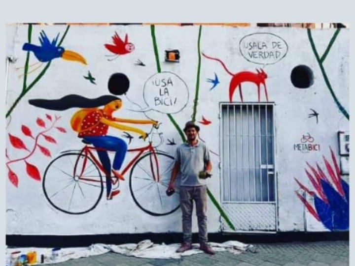 Su compromiso con el ciclismo urbano también va más allá de sus traslados. Ha colaborado con la asociación Meta Bici, diseñando y pintando murales que fomentan el uso del pedal en la provincia.