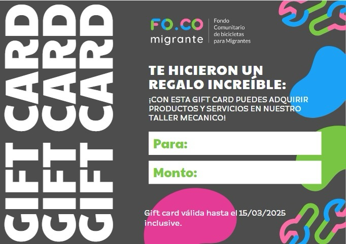 En Foco Migrante, la idea navideña es simple y efectiva. Una giftcard que funciona como saldo para usar en el taller sin restringirse a un producto específico. “Se puede comprar cualquier cosa, eso incluye todo tipo de servicios y todos los repuestos”, explica Daniel Lanfranco. En la lista entran desde lo grande hasta lo chico, agrega. “guantes, buffs, caramañolas, cascos, puños, candados”. Un detalle que hicieron fue imprimir las tarjetas físicas, para que se puedan dejar debajo del arbolito.